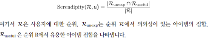 - 순위에 대해 의외성을 가지면서도 유용한 아이템의 비율을 측정(사용자 스터디를 통해 구할 수 있음)