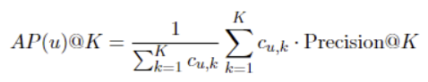 - AP@K(Average Precision)는 순위의 K번째까지에 대해 각 적합 아이템까지의 Precision을 평균한 값임